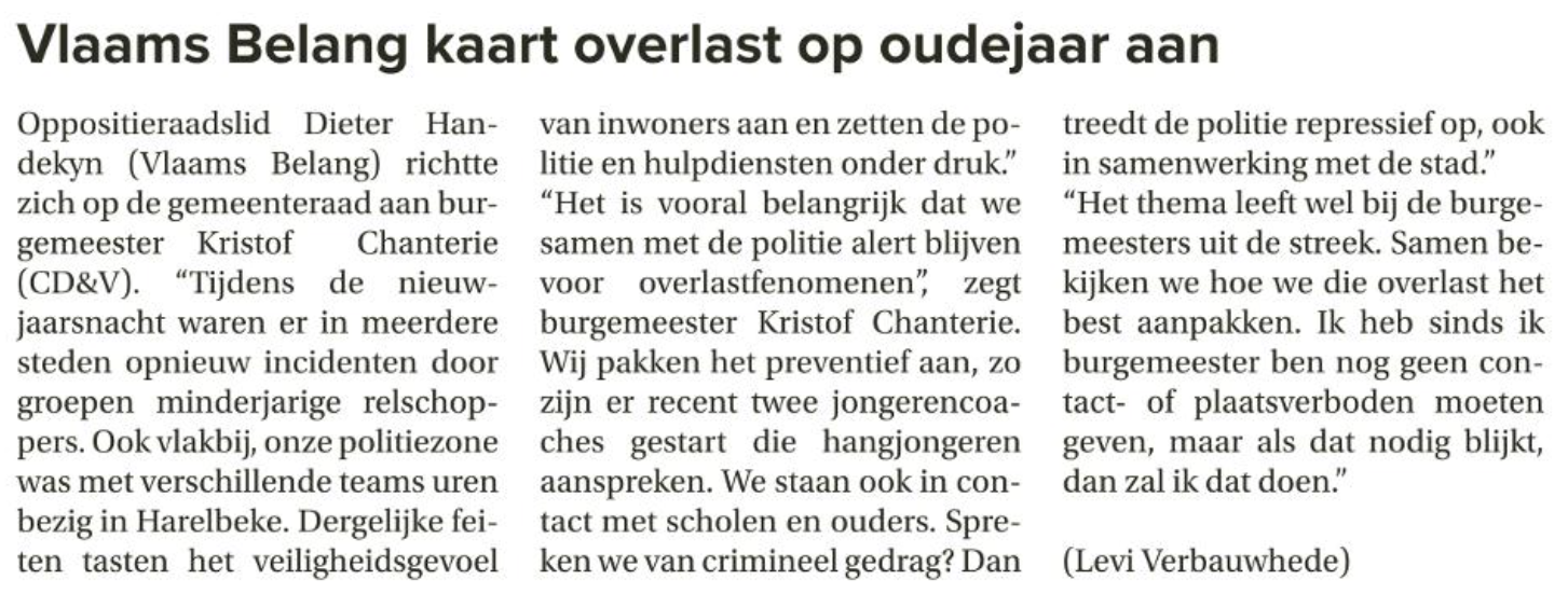 De burgemeester stelde in zijn antwoord dat er geen feiten of meldingen waren in Beveren-Leie en dat de politie daar niet moest optreden tijdens de nieuwjaarsnacht. Handekyn neemt daarvan akte, maar benadrukt dat de impact wel voelbaar is binnen politiezone MIRA.