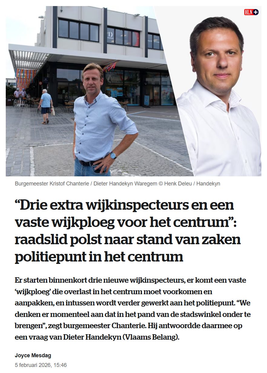 Op aandringen van onze fractie kwam er in augustus vorig jaar uiteindelijk een officiële vraag vanuit het stadsbestuur aan politiezone MIRA om de opening van een politiepunt in het centrum te onderzoeken. Daarom vroeg Dieter naar de invulling van een “centraal aanspreekpunt”, zoals beschreven in de beleidsverklaring 2026-2031, en naar de versterking van de wijkdienst Waregem Centrum met drie bijkomende inspecteurs.